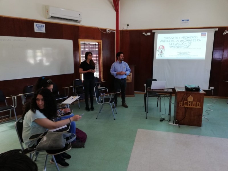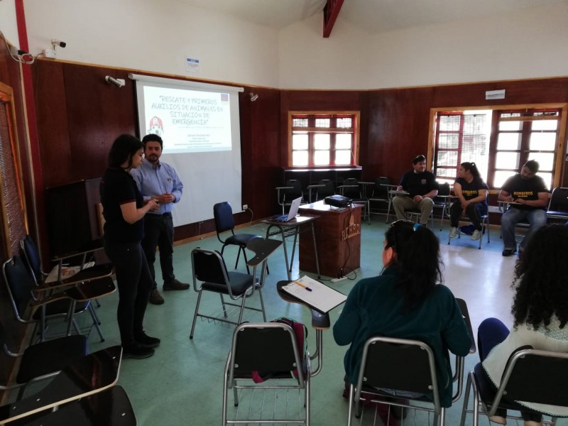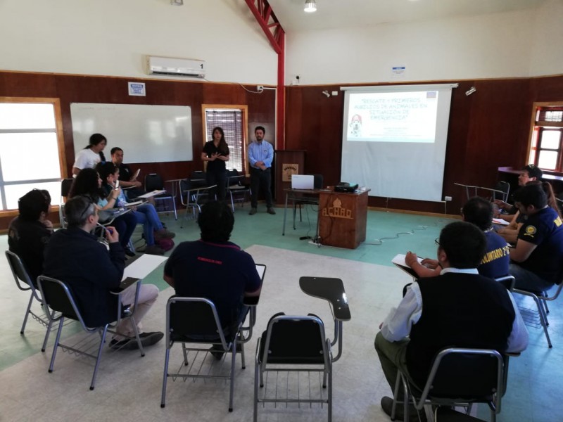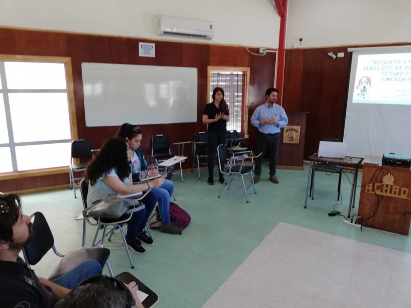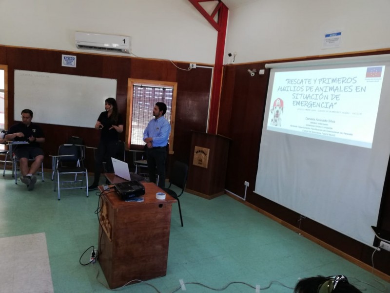 Curso de Rescate y Primeros auxilios de animales en situación de emergencia efectuado por la médico veterinaria Daniela Alvarado Silva voluntaria de la Octava Compañía, ayudante departamento de planificación de Operaciones de Rescate, Cuerpo de Bomberos de Puerto Montt que contó con la presencia del Grupo de Apoyo Veterinario, comandante Sr. Ruperto Soto Altamirano, voluntarios y voluntarias de las compañías del Cuerpo de Bomberos.